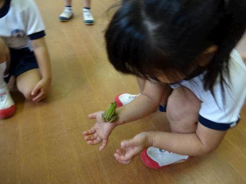 葉っぱ上にのったカエルを見て喜んでいました。