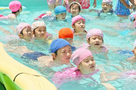 幼稚園のプールよりも数倍大きな学園プールにも入りました。子ども達は大喜び!!