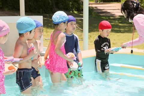 待ちに待ったプール ♪ 気持ちがいいな~。まぶしい太陽の下、子どもたちの歓声が響いています。
