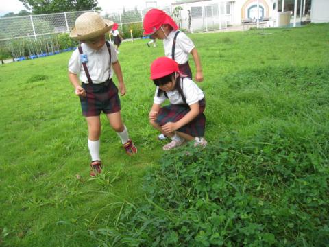園庭に行くと、ピョンと草の中から何かが跳んでいます。「わぁ! バッタ!」「どこ!見たい!」友達がバッタを見つけると、みんながいるところへ嬉しそうに集まってきます。