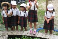 池の中の金魚やカエルは元気にしているかな? 池を見ると「いた!」「泳いでた!」金魚やカエルも元気に泳いでいましたね。久しぶりの園庭に子ども達は笑顔いっぱいでした。