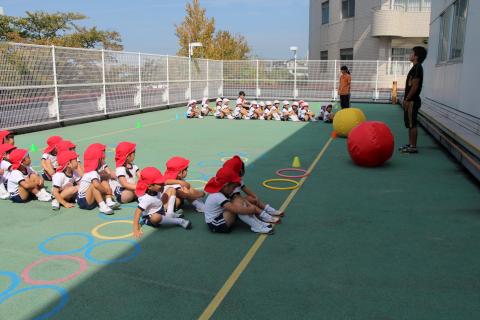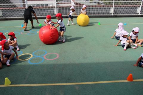 今日は大玉ころがしの練習をしました。まだまだ2人で大玉を転がすのは大変です。それでも、大玉を転がす子ども達はとても一生懸命でした。これから運動会に向けて、力を合わせて頑張りましょう。