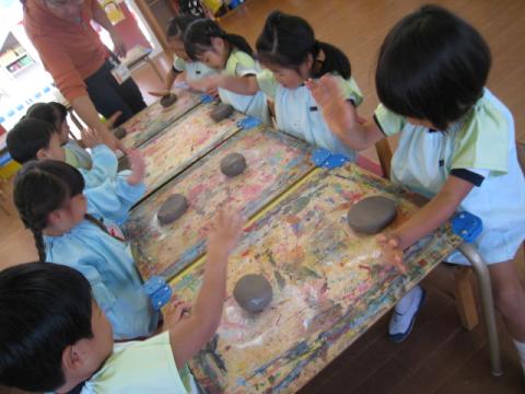 「よいしょ!」 「かたい!」 苦戦しながらも、子どもたちは、手のひらに力を入れて一生懸命粘度をのばしていました。「お花の形!」 「星のお皿にする」 と、好きな形にし、絵の具で色付けしました。この後は、陶芸の先生がお皿を焼いて下さいます。完成まであと少し。出来上がりが楽しみですね。