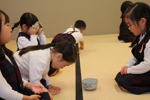 10月から子ども達がお点前を始めました。「“おいしくなあれ”と心をこめてお茶を点てると美味しくなりますよ。」と教えて頂いて、一人ずつ毎回全員が少し緊張しながら、茶筅を使ってお茶を点てています。子ども達は「前よりも今日のお茶はおいしかった」と言います。点てた子もにっこり、戴いた子もにっこりです。2月に保護者の方々においしいお茶を点てて我が子のお茶を味わって頂くことになっています。楽しみです。