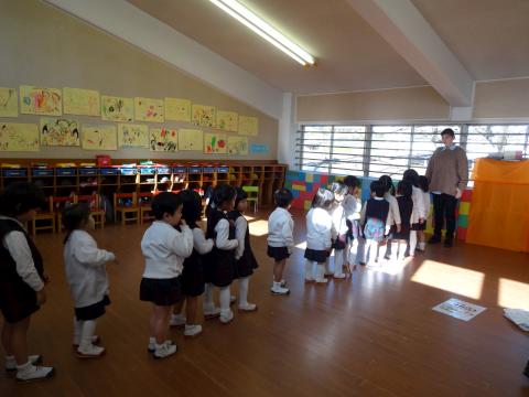 英語の先生は、英語の時間、英語しか話しません。はじめは驚いていた年少さんですが、今ではすっかり慣れて楽しい時間です。この日は、次回のレッスン「 My doll has a long skinny neck 」 に進む為に体を使って 「短く太く (short fat ) と 「長く細く ( long skinng )」 の線を作りました。また、 「首の長いきりんさんがお辞儀をするのは大変なこと。」 「カンガルーは長い太い尾尻を使って遠くに跳ぶ。」 ということを体で表現して遊びました。
