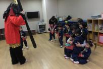 今日はりす組の豆まきです。お部屋の前に 「柊鰯(やいかがし)」 を飾り準備万端。絵本を読んで豆まきの練習をしていると、どこからか怖い鬼が! どきどき、はらはら、泣いてしまう子もいましたが、みんなで大きな声で 「鬼は外、福は内!」 と言って鬼を追い払いました。絵本のようにみんなのお腹の中の泣き虫鬼やおこりんぼ鬼も一緒に退治しましたよ。