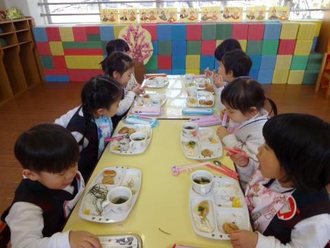 今日はひな祭り。年中は、和室に飾っているお雛様を見に行った後、お内裏様とお雛様の制作をしました。作る前から 「やったー!」 「着物(和柄)の折り紙だー!」 と、大喜びです。着物の襟を重ねて折ることができると 「おお!」 「できた!」 と、感動していました。後ろに金の屏風をつけたら完成です! 素敵な雛人形ができました。年少も、折り紙でかわいいお内裏様とお雛様を作りましたね。給食は、散らし寿司。 「今日は、ひな祭りだものね」 「すごく美味しい!」 と嬉しそうに食べていた子どもたちです。