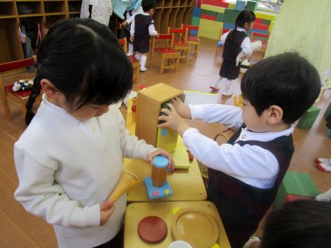 今日から新入園児たちがお母さんと離れて一人で登園です。初めてのお世話係で緊張していた年長さんたちでしたが、靴箱やロッカー、タオル掛の場所など、優しく手をひいて教えてあげていました。朝のお支度が終わった後も一緒に遊んでくれましたね。明日からも頑張ってくださいね♪