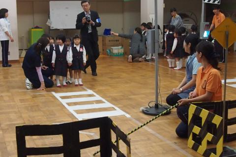 11日は、幼稚園のリズム室で交通安全教室がありました。奈良西警察署のおまわりさんとお友だちのニャーコちゃんが横断歩道の正しい渡り方を教えてくれました。また、誘拐されないように気をつけましょうと 『イカのおすし一人前』 という標語も習いました。お話を聞いた後は、実際に横断歩道や踏切の渡り方も練習してみましたよ。最後には、パトカーを見せてもらい、サイレンを鳴らしてもらって子どもたちも大喜び!! 今日から教えてもらったルールを守って安全に歩きましょね。