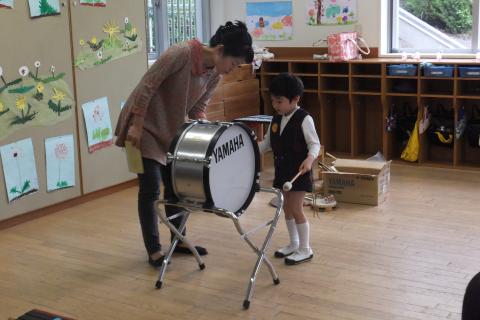 合奏では、大太鼓や木琴、トライアングルなどの楽器の名前と、鳴らし方を教えていただきました。初めて触る楽器にドキドキしながらも、「わぁ~、すごい!!」 「きれいな音だね。」と、みんなとても嬉しそうでしたね。