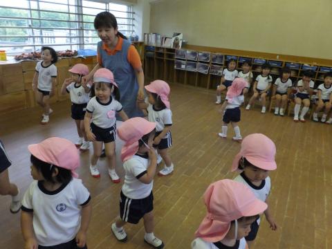 今日は、朝から曇り空。帽子をかぶってお外に行こうと靴を履き替えたら、ぽつぽつと雨が!残念!では、幼稚園探検に出かけましょう。年中さんのところでザリガニを観察した後、年長さんのお部屋を訪問しました。一緒にリズムをしたり、お歌を歌いましたよ。ちょっぴりどきどきしたけど、「また、おいでね。」と言ってもらってみんな嬉しそう。リズム室で体操も見学しましたよ。