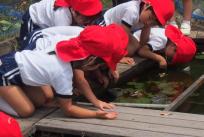 幼稚園のお池の金魚をみんなで見に行っています。子供たちは指を入れたら金魚さんが「チュッとしてくれた!」と、とても嬉しそうでした。また、トンネルで寝ている金魚さんや、すいれんの葉っぱからしっぽだけがヒラヒラ見えている金魚さん等、色んな様子の可愛い金魚さんも見る事が出来、子供たちは大喜びでした。みんなでお池の金魚の制作もしましたよ。