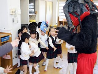 2月1日に少し早い豆まきが行われました。オニの登場に子ども達は大はしゃぎ、オニがお部屋を回って子どもたちを驚かせ「ワイワイ、キャッキャ」と逃げ回ります。また子ども達は「オニは外」と豆をぶつけてオニを追い払おうとします。そしてとうとう最後は子ども達の勢いにオニも降参しお部屋を出て行きました。