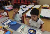 2歳児クラスは13日からお弁当とお昼寝が始まりました。制作や活動をした後、楽しみにしていたお弁当を開くと「見て!見て!」「ママがつくってくれた!」「ブロッコリー、食べれる!」とみんな大騒ぎ。お弁当を食べた後はお家から持ってきたタオルケットにくるまってみんなで仲良くお昼寝もしましたよ。