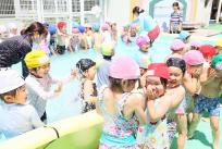 27日(月)からプールが始まりました。初日は天気も良く、「はやくプールに入りたいなぁー」「見て。こんなプールバックだよ」 「ピンクのかわいい水着持ってきたよ」 と、朝から嬉しそうに登園してきた子ども達。プールでは、ピョンピョン跳んだり、走ったり、ワニさんになったり、魚になったり、水鉄砲をして喜んでいましたね。 初めてのプールだった年少さんは、「あー、楽しかった!! 明日も入ろうね♪」 と、笑顔でした。