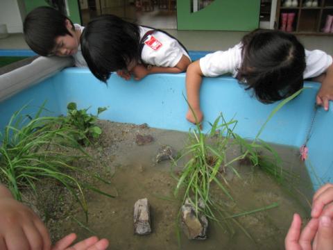 田んぼからやってきたカエルと遊んでいます。幼稚園では、ケースの中で、草の上に何匹も重なったり、ぎゅっと身を寄せたりしているカエル。「せまそうだね」と、子ども達も心配の様子。「田んぼみたいなお家!」「広いお家にしよう」「カエルさんも喜ぶ!」と、カエルが喜んでくれるお家を作ることにしました!「どろどろの土」「水もいる」「草もたくさんいる」「石も好き」みんなで何が必要か考えながら作っていきます。力を合わせて作ると、素敵な田んぼのお家が完成しました。カエルをお家に入れると「泳いでる」「元気に跳んでる」「お家作ってくれてありがとうって言ってる」と、子ども達もカエルも、とても喜んでいました。