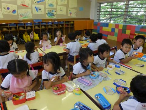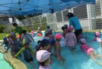 今日から夏季保育が始まりました。まずは、みんなのお楽しみのプールへ! ぐるぐるプールの中を走りまわったり、水のかけあいっこをしたり、水鉄砲でも遊びました。水が冷たくて気持ちよかったね♪その後は、「まつぼっくり」という楽しいおもちゃがたくさんある帝塚山大学こども学科の子育て支援施設へも遊びに行きました。広い部屋にはボールプールやおままごとセットなどたくさんの遊び場があり、子どもたちは大喜び!「次はこれをする!」「あっちも見に行こう!」と大興奮でした。その後は、美味しいお弁当を食べて「おにぎりがあるの!」「たまごやき大好き!」楽しい時間を過ごしました。