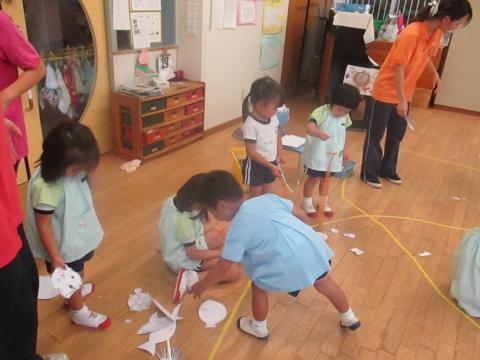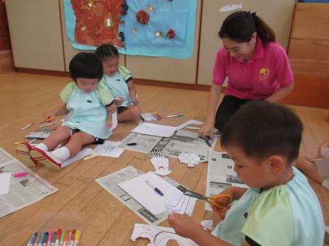 今日はあいにくの雨でしたので、制作で魚を作って、魚釣り遊びをしました。マジックで描いた魚は、シャチやサメ、タツノオトシゴ、カメ、金魚といろいろな魚があって、面白かったですよ。この出来上がった魚を上手く釣れるかな~!? 「見て、釣れたよ!」 と喜んでいた子ども達。お昼からは、『 シュレック 』 のDVDを楽しみましたね。