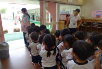 今日は、火災避難訓練でした。園長先生の 「給食室で火事が発生しました。」 というアナウンスが流れ、担任の先生の指示に従ってタオルを口に当て、学園のハトの広場へ非難しました。給食室の火事ということでしたので、門からではなく、園庭の奥の普段は出入りしない扉から大学の校舎を通ってハトの広場に出ます。みんなが集まったら、園長先生のお話を聞きました。混乱することはありませんでしたね。次回は、今日より早く避難できるよう頑張りましょうね。
