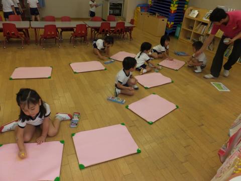 朝、お兄さんお姉さんは小学校の運動場へ練習に行きました。「いってらっしゃい!」と見送ってみんなはさつまいもでぺたぺた、スタンプを楽しみました。スモックを着たり、脱いだりするのもとても上手になりましたよ。お弁当の後は、大好きな砂場で遊んだり、すべり台を何度もすべりました。
