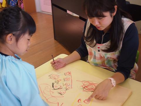 運動会のお絵描きをした子ども達。 「かけっこ1等賞だったから、かけっこの絵を描いたよ!」 「綱引き、もう1回したいから綱引きの絵を描いたよ!」 「組立体操の御神輿は難しかったけど、成功してよかった! だから、その絵を描いたよ。」 「障害物競走は、ドキドキしたよ。勝つかなー、負けるかなーって。」 「また、運動会したいな~」 と、様々な思いを聞くことが出来ました。子ども達にとっては、楽しい運動会だったようです。そして、もう来年の運動会が楽しみですね。