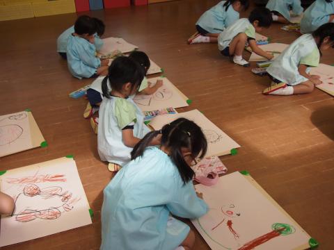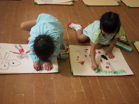運動会のリズム作品 『 こりすとボール 』 『 あかうみがめのこどもたち 』 のお話のお絵描きをしました。一人ひとり、お話の中の好きな場面を描きます。年長は、「子りすのガンくん、ピンちゃんの大好きな空と丘を描いたよ。」 「川の周りは、きれいな風景だなぁって思って描いたよ。」 「お話で遊ぶの楽しかった~」 と。 年少は、「子りすのガンくん、ピンちゃん、ふわふわのしっぽがあって、かわいいんだよ~」 と。 年中は、「ウツボは、怖いでー。あかうみがめの子、食べられそうになって逃げてるところだよ。」 「きれいなお魚がいっぱい泳いでるよ。」 と、みんないろいろ教えてくれました。お話を好きになり、楽しんで遊んできたことが子ども達から伝わってきましたよ。