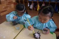 先日、陶芸の豆川先生に来て頂き陶芸を行いました。年少組は好きな動物を作りましたよ。 「何を作ろうかな~?」 「ゾウさんがいいな~!」 と、みんな朝からとってもワクワク気分 ♪ 先生に粘土をもらい、さっそく開始です! 粘土を伸ばしてかっこいい鼻のゾウを作ったり、長い耳のかわいいウサギを作ったり、頑張っていましたよ。仕上げに絵の具で色付けをして、とっても素敵な作品に仕上がりましたね。 「みてみて! 出来たよー!」 と、子どもたちも大満足の笑顔でした。完成した作品は、制作展で展示しますので、楽しみにしていてください!