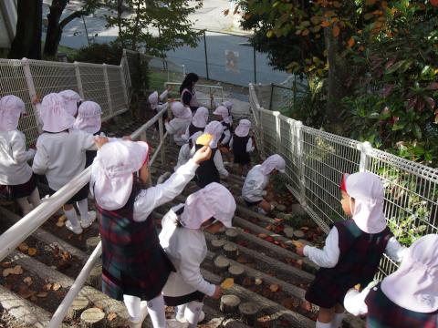 きれいに色づいた落ち葉が秋風に舞っています。年少のお友だちは、学園内を散歩に出かけ、葉っぱを拾ったり、舞っている葉っぱを追いかけたり、葉っぱを飛ばしたりして遊んでいます。 「見てー! こんな大きい葉っぱ」 「赤と黄色が混ざってるよ。」 「葉っぱ落ちてきたー!」 「葉っぱの雨だよ。」 と、楽しそうですよ。