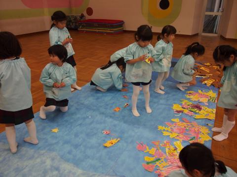 年中は運動会リズム作品 『あかうみがめのこどもたち』 の壁面制作です。楽しみにしてください。