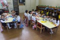 今日は、クリスマスツリーの制作です。ツリーを組み立てていくのですが、年長のお友達は、年少のお友達が困っている時に「手伝ってあげる」「こうするんだよ」と、優しく教えてくれていましたよ。年少のお友達も嬉しそうでした。「一番上にお星様つける」「リボン飾ろう!」「雪もつけよ」と、楽しんで飾りつけをする子ども達。素敵なクリスマスツリーが出来上がりましたね!