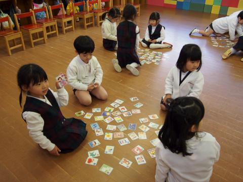 年中のかるた遊びは、どの札が読まれるのか… 子ども達はじっと札を見つめ、とても集中して先生の声を聞いていました。「ハイ!」と大きな声を出して勢いよく札をとるたびに「やったー!」「とれたー!」と喜んでいましたね。1枚の札に手が重なっても「ジャンケンして決めよう!」と子ども達で解決していた場面もありましたよ。