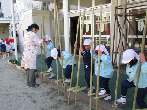 寒さもより一層厳しくなり、寒い日が続きますが、年長組の子どもたちは毎日竹馬の練習をしています。日に日に乗り方のコツをつかんできているようで、「寒い~!」「手が冷たい!」と言いながらも、一生懸命頑張っていますよ♪ 歩けるようになったお友達が、「少し竹馬を前に倒すと歩けたよ!」「斜めにするんだよ♪」と、優しく教えてくれます。1歩歩けたら黄色テープ、5歩歩けたらピンクテープ…と、子ども達の励みになるように、歩けた歩数によって竹馬にシールを貼っています。子ども達は「乗れるようになるぞ!」と、やる気満々!! そんな子ども達のパワーで、みんなで元気に寒さを乗り越えていきたいと思います。竹馬、頑張りましょうね♪