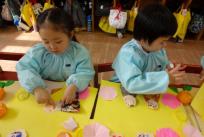 先週、ひな祭りに向けて、お雛様とお内裏様の制作をしました。「お雛様の制作をするよ」と、伝えると大喜びの子ども達!!「お家にも飾ったよ」と嬉しそうに教えてくれました。和柄の折り紙を着物になるように折ったり、ペンで顔を描いたり、「お雛様はきれいな着物を着ているの!」「お内裏様はかっこいい顔している!」と楽しみながら作っていましたよ。みんなの可愛いお雛様・お内裏様が出来ましたね。