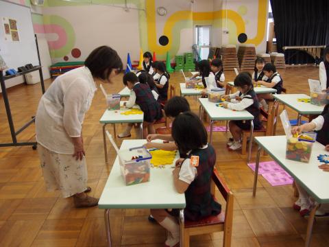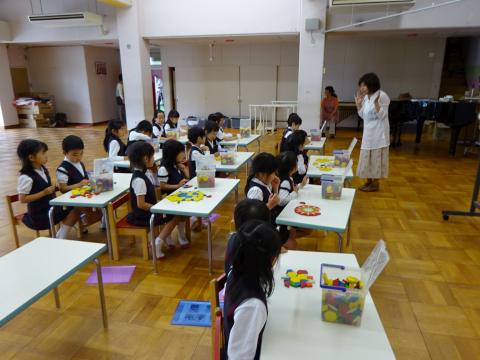 小学校の工藤先生によるワクドキがはじまりました。先生と歌遊びをしたり、かるたでことわざを習ったりしました。また、パターンブロックで、横の席の友達と自由に形を構成しました。初めてのワクドキは、とても楽しかったようで、また来週も楽しみにしている子ども達です。