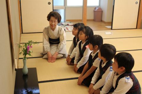 礼法の時間が年長組で始まりました。裏千家流尾崎宗栄先生のご指導のもと、和室でお部屋の入り方、歩き方、座り方、立ち方、ご挨拶等、和室での美しい立ち居振る舞い、またお箸を使って豆つかみをしたり、お箸の持ち方なども教えて頂きます。