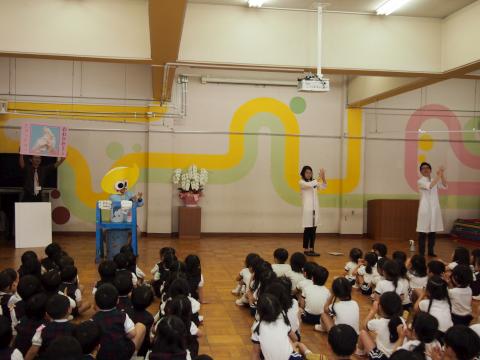 インフルエンザ0活動の一環として手洗い指導の観劇がありました。手洗いの嫌いなプー君。水だけでささっと洗った手に不思議な水をかけると・・・手が真っ黒に!!! 「うわー」 「汚い!」 と子ども達はびっくりです。どうすれば綺麗に洗えるのか歌に合わせて手を洗う練習をしました。年長は実際に体験するため、保育室に戻って粘土遊びをし、その後不思議な水をかけてもらうと、手は真っ黒に!! しっかり手を洗わないとダメだということが改めてわかった子ども達です。これからも丁寧にしっかりと手洗いをしていきましょうね。