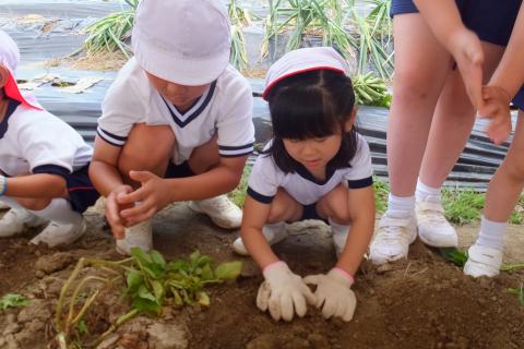 2日(金)、帝塚山学園の農園で、幼稚園の年中児、小学5年生、大学生と、みんなで一緒にじゃがいも掘りをしました。登園してくると、「じゃがいも掘は楽しみ♪」「頑張っていっぱい掘る!」と、気合十分な子ども達。学園農園に着き、いよいよじゃがいも掘りのスタートです。「ちゃんと掘れるかな?」「いっぱいあって大変!!」と言いながらも、「大きいの掘れた!」「お顔みたいな形してる!」と、とても嬉しそうに、一生懸命頑張っていましたよ。みんなで収穫したじゃがいもは、給食のビーフシチューでいただきます。楽しみですね♪