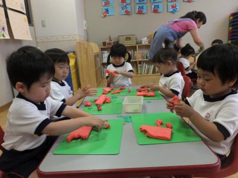 幼稚園で初めて粘土遊びをしました。この前みんなで摘んだいちごを思い出しながら、赤い粘土をおててでくるくると丸めて作りました。粘土は初めてのお友だちもいましたが、上手に手のひらで丸めていっぱい作りました。「いちごだ!!」「いっぱい!!」と楽しそうでしたよ。出来たいちごは籠に入れてお家に持って帰りました。