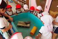 5匹のカメが幼稚園に来てくれました。初めて見た子ども達は大興奮で「カメだ!!」「大きい!」「すごいね!」と興味津々でした。かめさんが動くたびに、「首が!伸びた!!」「グググっと伸びてる!」「すごい!!」「わあ!」とびっくりしたお友だちもいましたよ。今ではかめさんと仲良しで、一緒に園庭にお散歩に出かけましたよ。「かめさんこっちだよー!!」「楽しいね」とかめさんも子ども達も嬉しそうでした。