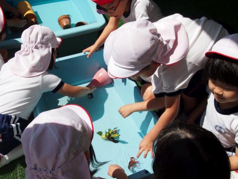 タライに入れたそのザリガニを「お家(植木鉢)の中にいた!」「ほていそうに隠れてる!」と嬉しそうに見ていました。はじめは、掴もうとすると大きなはさみをふりあげるザリガニや、バックするザリガニに驚いていましたが、毎日ザリガニと遊ぶ中で、上手に掴まえるお友だちも増えてきましたよ。