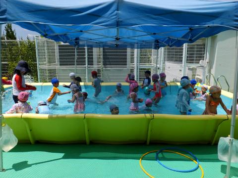 プール遊びでは、タツノオトシゴ、ヒトデ、フグの形をした小さな水鉄砲やかわいいジョウロ、ボールで思い思いに遊んでいて十分に楽しみましたね。