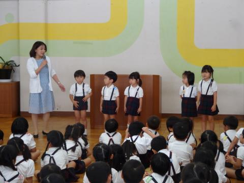 新しいお友達の紹介後、始業式が始まり、園長先生と 「これからも大きな声でご挨拶をしましょう。」 「しっかりお話を聞きましょう。」 「2学期は楽しいことがたくさんあります。頑張りましょう。」 の3つのお約束をしました。