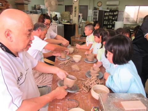 大塩昭山先生にご指導いただいた後、早速粘土をボールのように丸めていきます。それを手のひらで伸ばし底の部分を作り、そこに長く伸ばした粘土を重ねて側面を作っていきました。粘土を滑らかに伸ばしていくところは難しそうでしたが、先生にも手伝っていただきながら一生懸命に作りました。丸やハート、星、クマなど、それぞれ思い思いの湯のみ茶碗ができました。