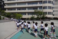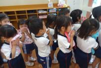 今日は火災避難訓練でした。「給食室で火事が発生しました。」 というアナウンスが流れ、タオルで口と鼻を押さえ、先生の指示に従ってハトの広場へ避難しました。給食室の火事ということでしたので、門からではなく園庭の奥の普段は出入りしない扉から大学の校舎を通って行きます。みんな真剣な顔で先生の後について、落ち着いて行動できました。次回は、今日よりはやく避難できるように頑張りましょうね。