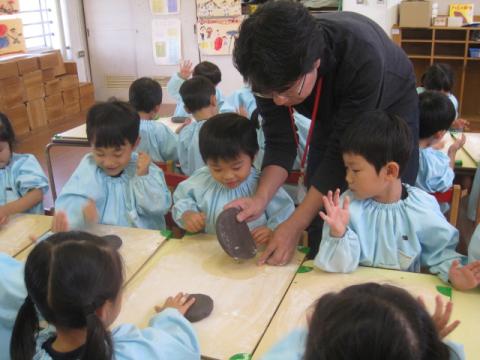 雅工房の豆川先生にお越し頂き、年中組両クラスは陶芸体験をしました。今回挑戦したのは、お皿作り!!丸まった粘土を、力いっぱい叩いて平らにし、お皿の形になってくると、「見て見て!出来てきたよ!!」と、嬉しそうな子ども達。形を整えたら、次は色付けと模様付けです。「どんな色にしようかな?」「模様つけるの面白い!」と、楽しみながら、それぞれ一生懸命頑張って、自分だけの素敵なお皿が出来上がりました♪ 完成したお皿は、制作展で展示します。楽しみですね☆