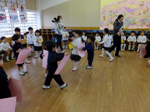 2歳児クラスのお部屋にも節分の鬼が来ましたよ。練習した通りに「鬼は外!!」と勇敢に豆を投げました。恐くて泣いちゃったお友だちもいたけど、頑張りましたよ。鬼を無事退治したので、みんなで「ばんざい」をしました。その後は、鬼の顔を描いて幼稚園のお部屋に見せに行きました。