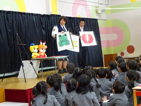 もうすぐ卒園を控えた年長組のみんなは、お家の方と一緒につくし会主催の“ティーパーティー”を楽しみました。警察署の方から交通安全のお話を聞いたり紙芝居を見たりした後、おいしいお菓子もいただきました。