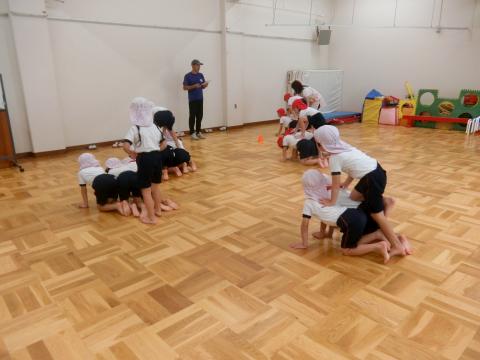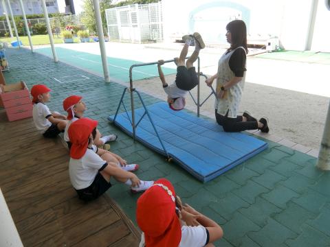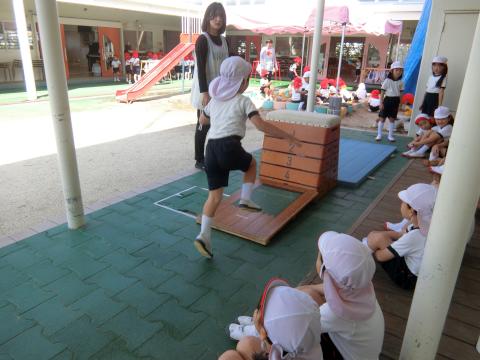 障害物リレーの練習では跳び箱や逆上がり…体操教室以外の時間も頑張っています。「最後まで頑張る!」「絶対に勝ちたい!」とやる気満々です。運動会まであと少し、頑張りましょう!