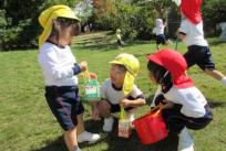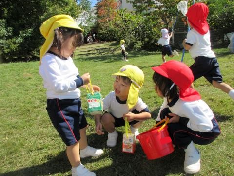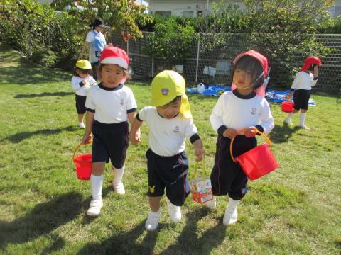 お天気が良いので、2歳児クラスは牛乳パックのバックを持って園庭にお出掛けしました。