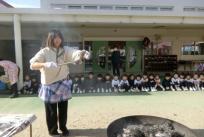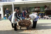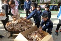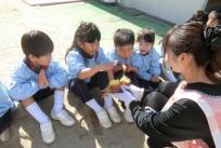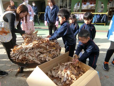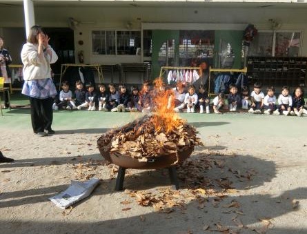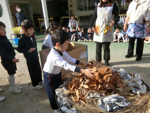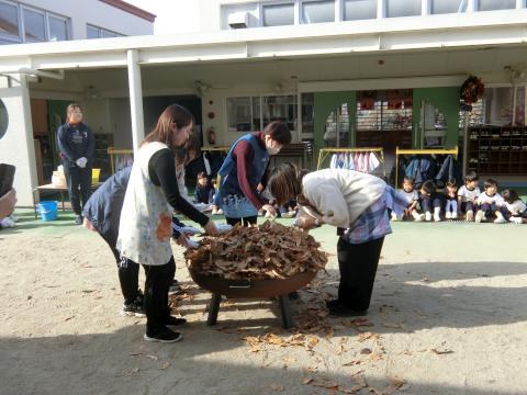 みんなが楽しみにしていた焼き芋パーティーがありました。家で集めて持って来てくれた葉っぱや、園庭でみんなが集めた葉っぱの他に、藁やもみ殻なども用意して本格的な焼き芋パーティーです。